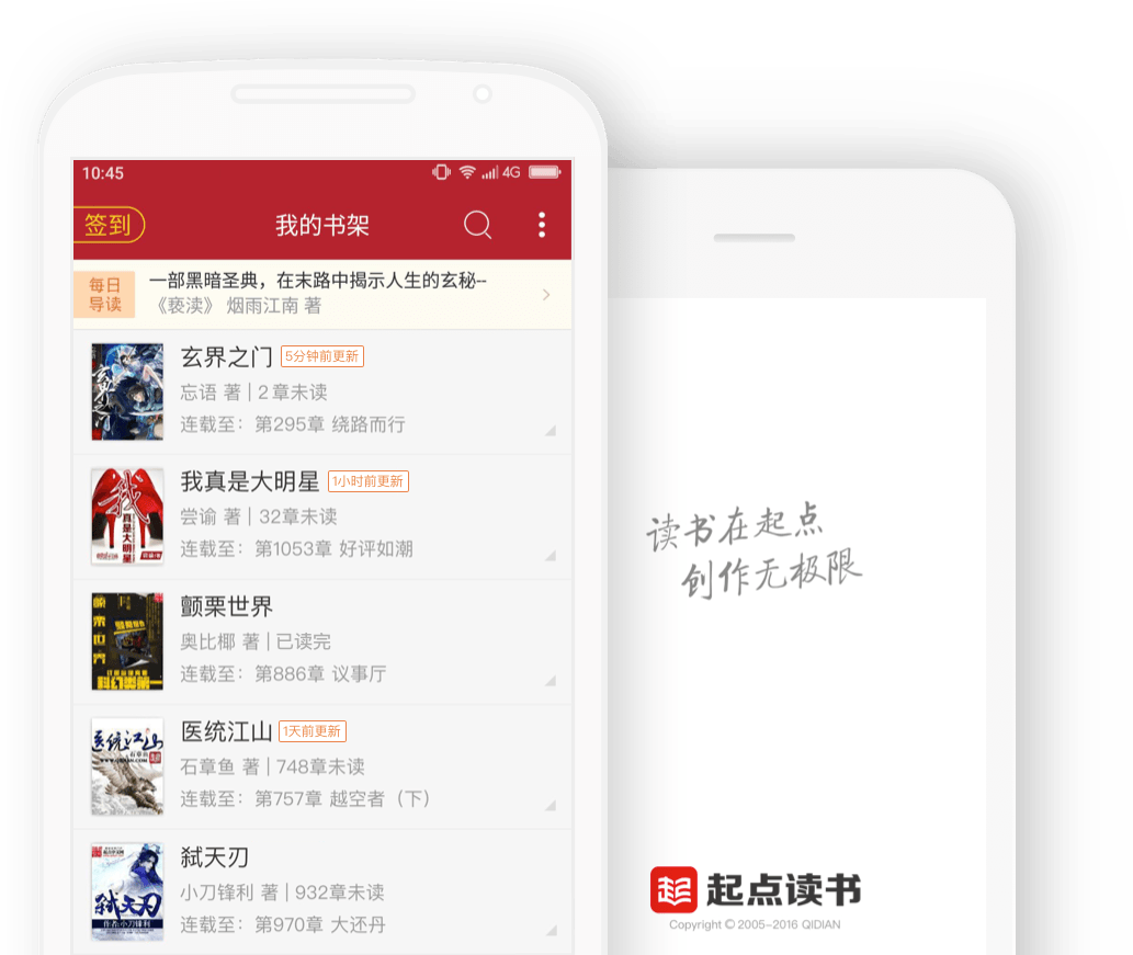 起点读书是起点中文网首创“在线收费阅读”服务的移动应用,百万原创作家与3亿读者在此互动创作,10年来大神作家群星璀璨,积累了数百万部优秀原创作品。让亿万书友在iOS、Android 等移动设备随时随地,畅享阅读。